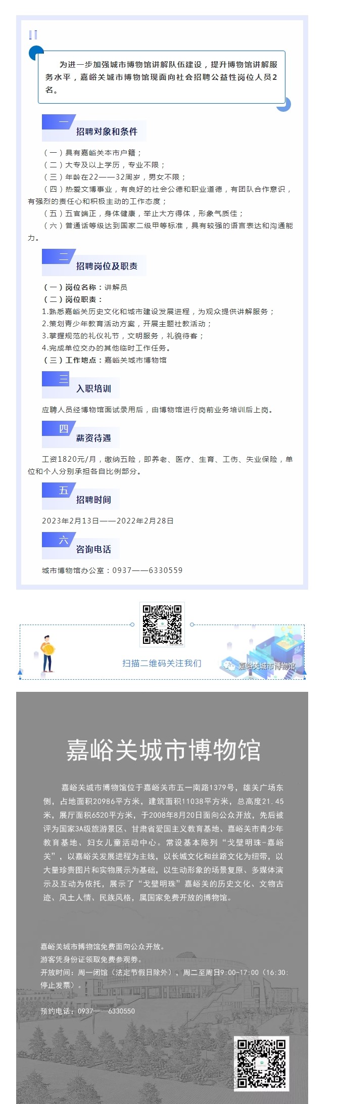 【招聘公告】2023年嘉峪关城市博物馆公益性岗位招聘公告