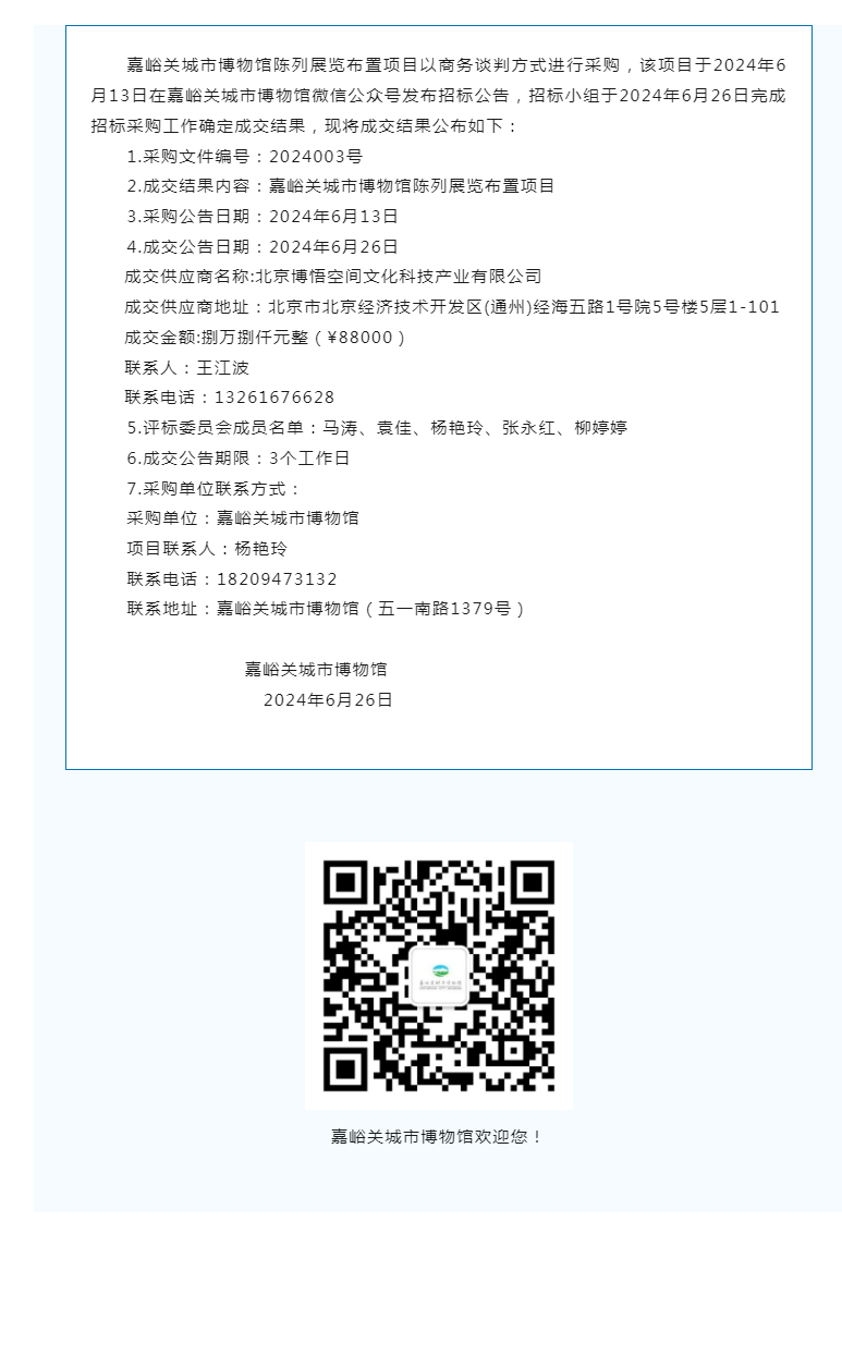 嘉峪关城市博物馆陈列展览布置项目成交公告